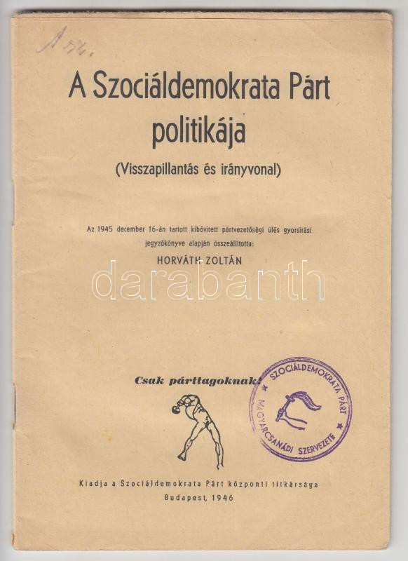 1946 Horváth Zoltán (szerk): A Szociáldemokrata Párt politikája. (Viss... https://www.darabanth.com/en/26-Major-auction/26.1/Other-collectibles/Printed-Materials~10311/1946-Horvath-Zoltan-szerk-A-Szocialdemokrata-Part-politikaja-Visszapillantas-es-iranyvo~II1404405