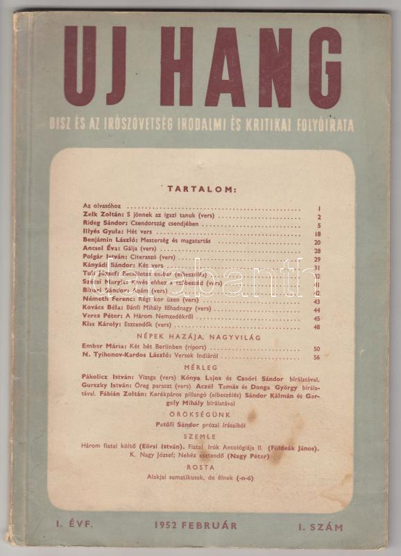 1952 Uj Hang. I. évfolyam, 1. szám. Szerk.: Benjámin László. Budapest,... https://www.darabanth.com/en/26-Major-auction/26.1/Other-collectibles/Printed-Materials~10311/1952-Uj-Hang-I-evfolyam-1-szam-Szerk-Benjamin-Laszlo-Budapest-1952-Ifjusagi-Lapkiad~II1420044