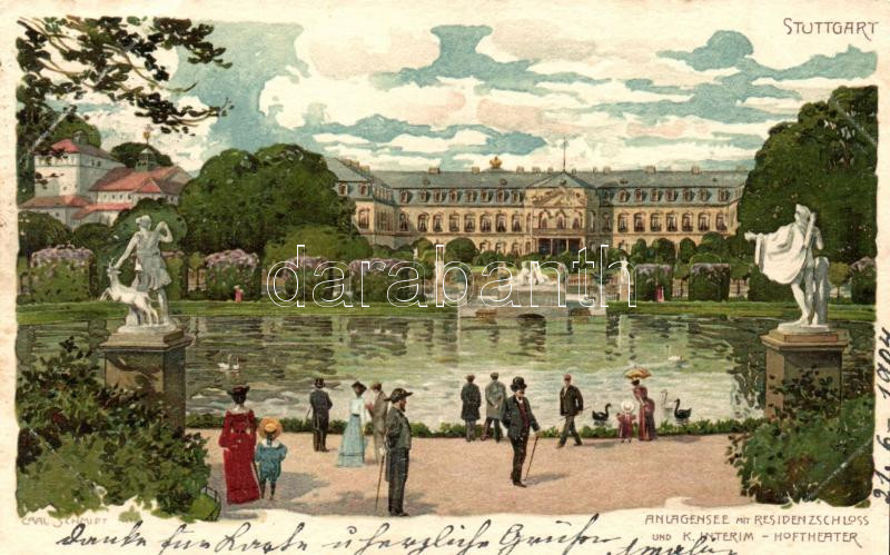 Description: Stuttgart, Anlagensee mit Residenzschloss, K. Interim-Hoftheater / promenade, castle, theatre. Künstlerpostkarte No. 3. von L. Schaller, litho s: Carl Schmidt