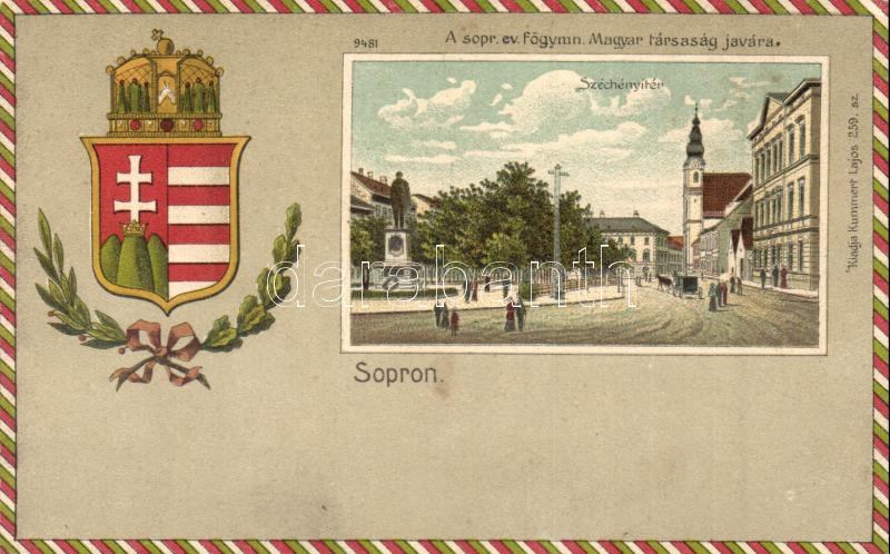 Sopron, Széchenyi tér; Segélylap az Evangélikus főgimnáziumi Magyar Társaság javára. Kummert Lajos magyar címeres 259. számú litho lapja (EK)
