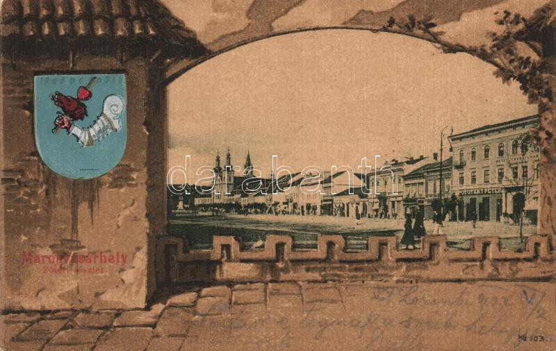 Description: Marosvásárhely, Targu Mures; Fő tér Pototzky Péter üzletével, Holbach Ede kiadása. Címeres litho keret / main square with shop, coat of arms, litho frame