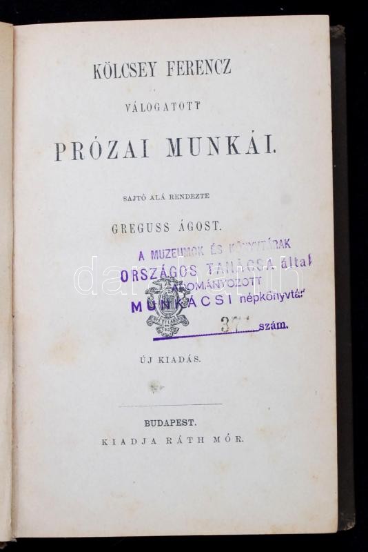 Kölcsey Ferencz válogatott prózai munkái. Sajtó alá rendezte Greguss Á... https://www.darabanth.com/en/260-Online-auction/260.0/Books/Books-Other-rarities~40/Kolcsey-Ferencz-valogatott-prozai-munkai-Sajto-ala-rendezte-Greguss-Agost-Bp-1874-Rath-~II1285440