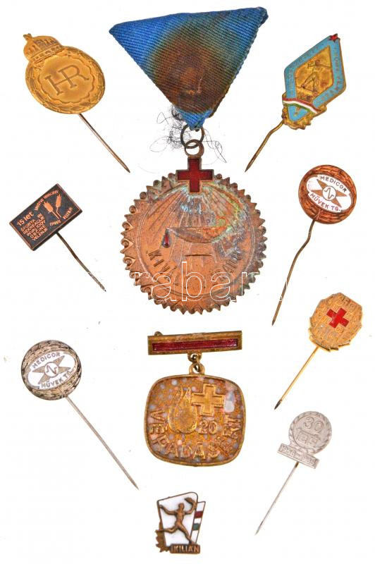10db-os vegyes jelvény és kitűző tétel, közte 1963. "MHS. Összetett Honvéd Verseny 1963" zománcozott fém kitűző, DN "Kiváló Véradó" jelvény mellszalagon T:vegyes