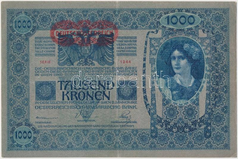 1902. 1000K hátoldalán piros "Deutschösterreich" felülbélyeg... https://www.darabanth.com/en/260-Online-auction/260.0/Numismatics/Hungarian-Banknotes~300006/1902-1000K-hatoldalan-piros-Deutschosterreich-felulbelyegzessel-valamint-valoszinuleg-h~II1282114