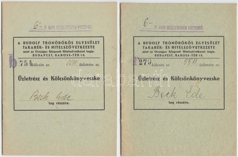 1941-1943. "Rudolf Trónörökös Egyesület Takarék- és Hitelszövetke... https://www.darabanth.com/en/260-Online-auction/260.0/Numismatics/Numismatics-documents-and-letters~300003/1941-1943-Rudolf-Tronorokos-Egyesulet-Takarek-es-Hitelszovetkezete-uzletresz-es-kol~II1285087