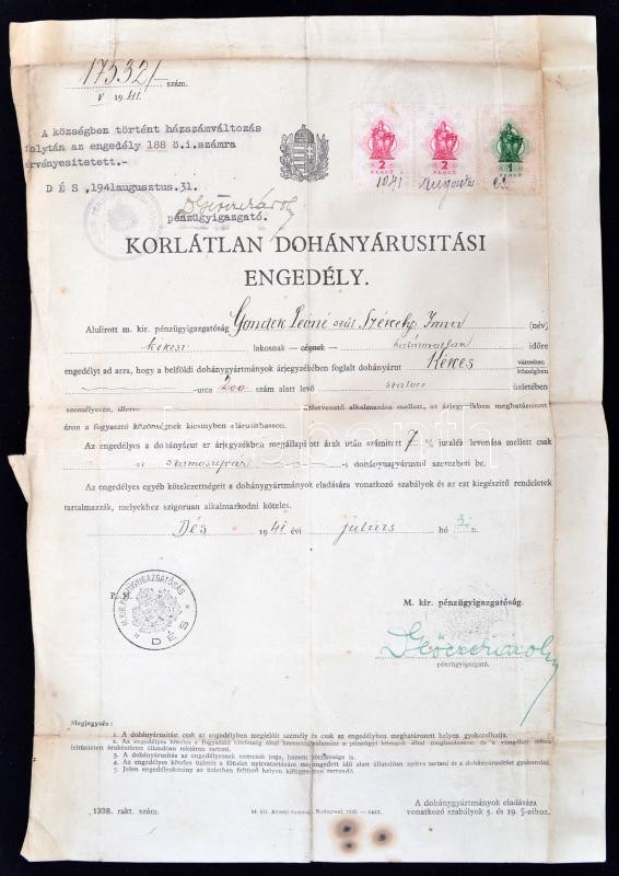 1941 Korlátlan dohányárusítási engedély, okmánybélyegekkel, pecséttel....