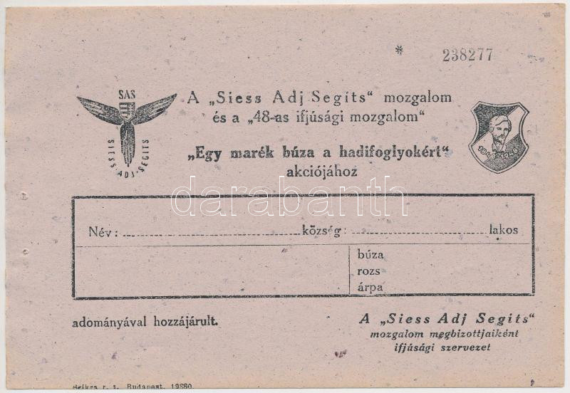 https://www.darabanth.com/en/260-Online-auction/260.0/Other-collectibles/Documents~15/1946-Siess-Adj-Segits--A-magyar-nep-osszefogasa-a-hadifoglyok-korhazak-es-tudobetegek-~II1281332