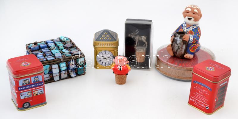 8 db különböző szuvenír a világból(fém dobozkák, dugó, poháralátét, stb.)