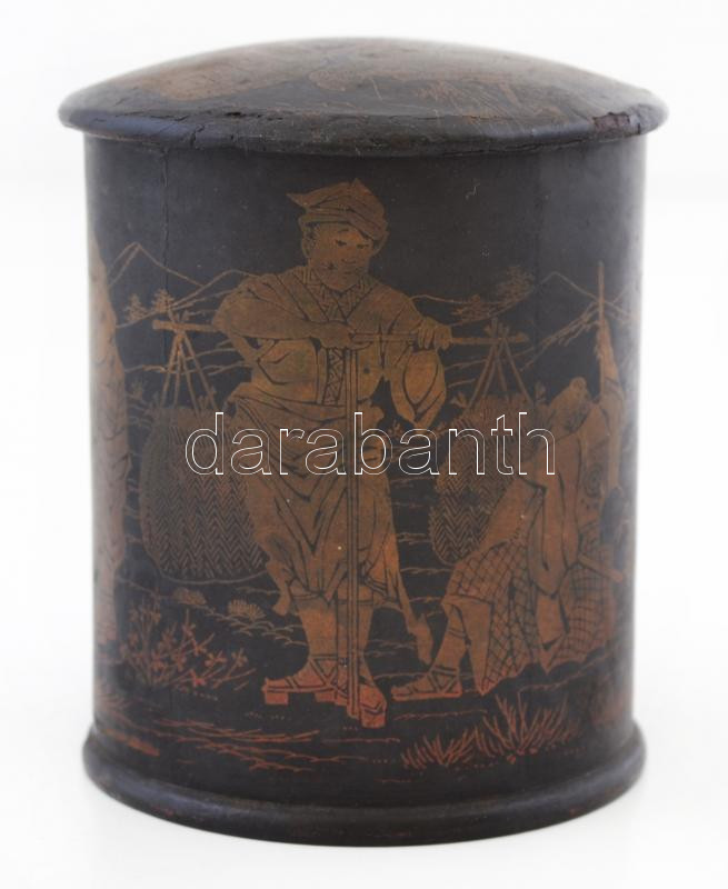Dekoratív, festett japán fadobozka, alján kis sérüléssel, d: 8 cm