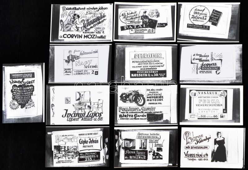 Description: cca 1947 Fekete György (1904-1990) budapesti fényképész reklámgrafikái különféle szolgáltatásokról, termékekről, ezekről készített mozikban vetíthető üveglemez diapozitív képeket, az eladásra kínált tétel 13 db papír- pozitív képet tartalmaz, melyek modern nagyítások a hagyatékában őrzött korabeli negatívokról, 10x15 cm-es fotópapíron
