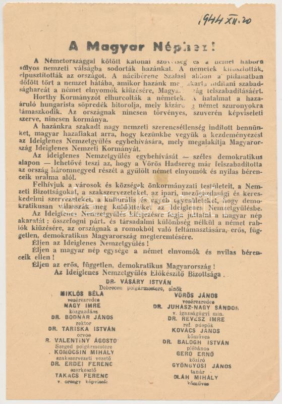 1944 "A Magyar Néphez!" Az Ideiglenes Nemzetgyűlés Előkészítő Bizottsá...
