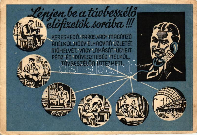'Lépjen be a távbeszélő előfizetők sorába!!!', a Magyar Kirá... https://www.darabanth.com/en/260-Online-auction/260.0/Postcards/Advertisement~100101/Lepjen-be-a-tavbeszelo-elofizetok-soraba-a-Magyar-Kiralyi-Posta-Tavbeszelo-Propagan~II1283908