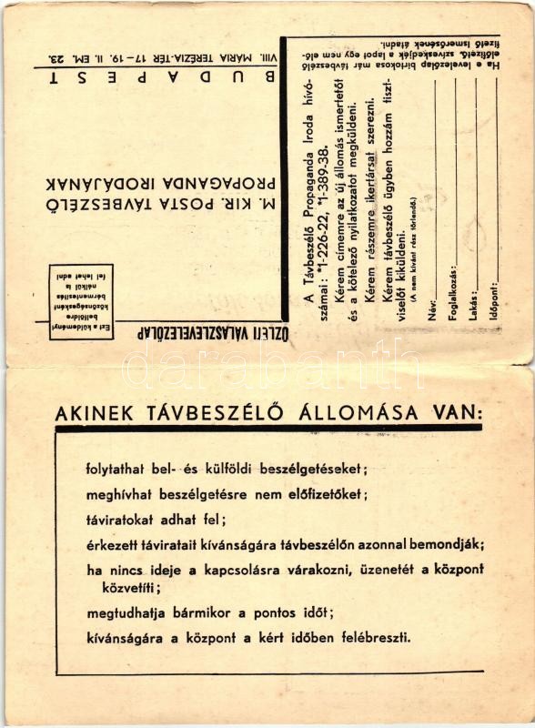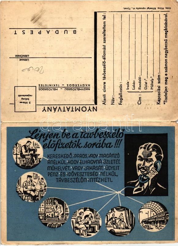 Description: 'Lépjen be a távbeszélő előfizetők sorába!!!', a Magyar Királyi Posta Távbeszélő Propaganda Irodájának reklámlapja és válaszlapja kihajtható képeslapon / advertisment postcard of the Hungarian Royal Post's Phone Propaganda Office, folding card (hajtásnál elvált / bent til' broken)