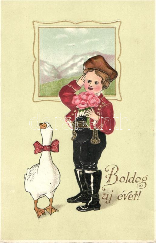 'Boldog új évet!' / New Year, Child in traditional dress, folklore, goose with bowtie, Erika No. 2575, litho, Emb. (EK)