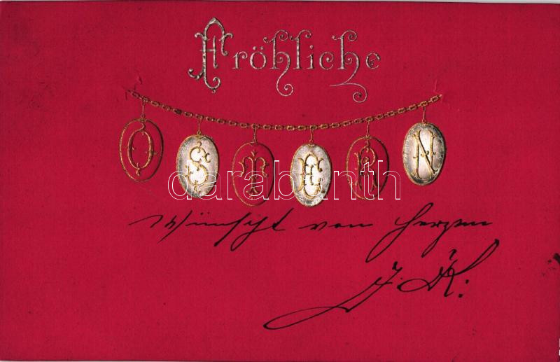 'Fröhliche Ostern' / Easter, eggs on chains, golden decorated, Emb.