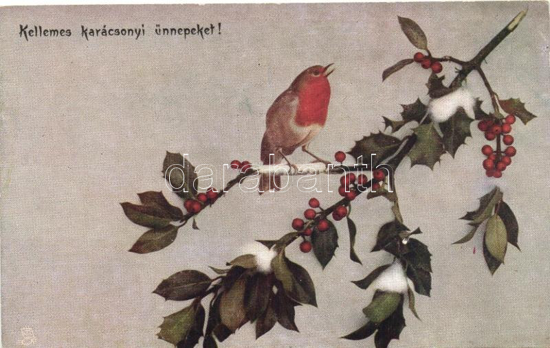 'Kellemes karácsonyi ünnepeket!' / Christmas, robin sitting on a holly branch, Raphael Tuck & Sons Oilette No. 8527 (pinhole)