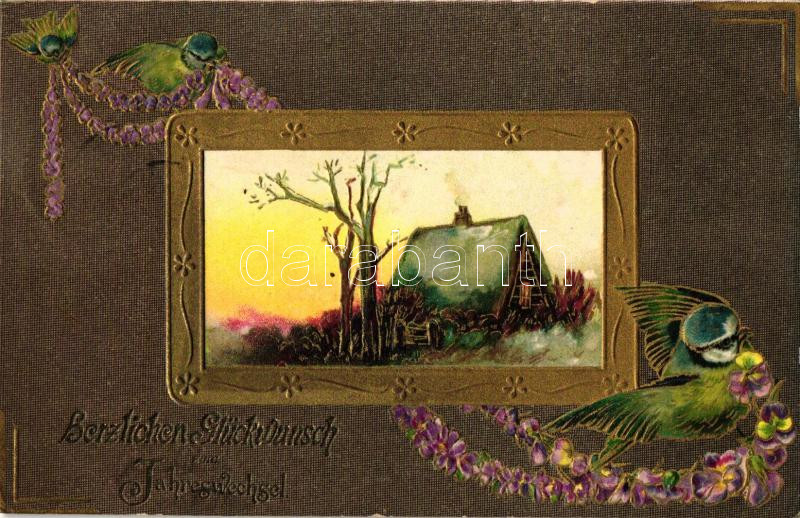 New Year, hut, birds, floral, Art Nouveau Emb. litho