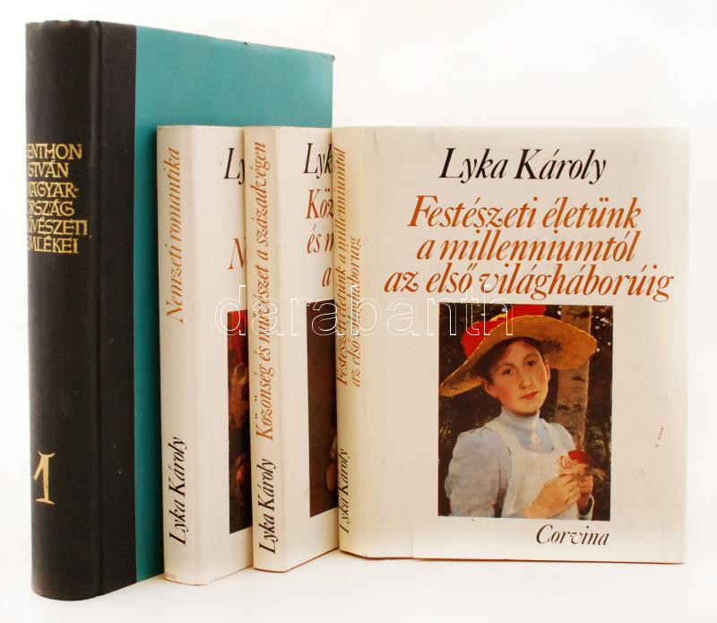 Description: Vegyes művészeti könyvek, 4 db: Lyka Károly: Festészeti életünk a millenniumtól az első világháborúig; Közönség és művészet a századvégen; Nemzeti romantika. Genthon István: Magyarország művészeti emlékei I.