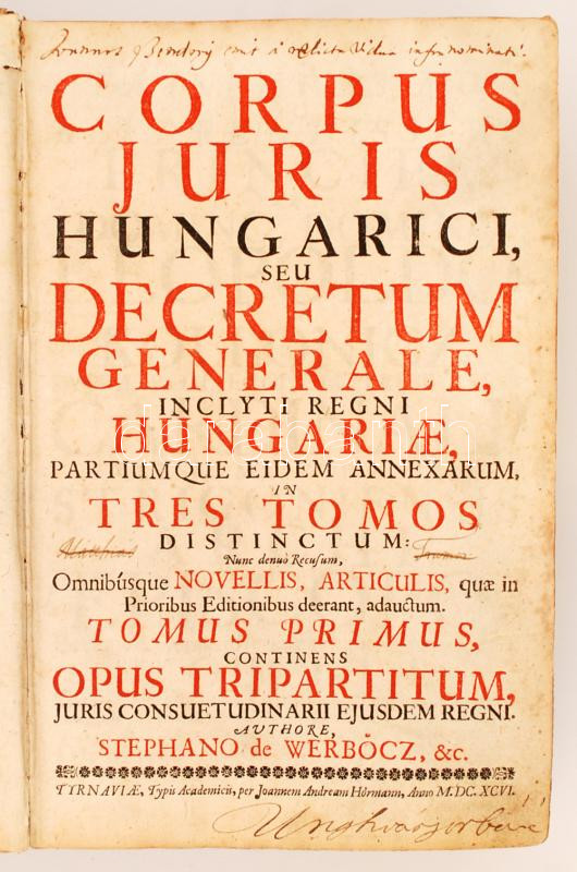Corpus Juris Hungarici, seu Decretum Generale, inclyti Regni Hungariae, Partiumque eidem annexarum inn tres tomos distinctum. Nun denuo Recussum, Omnibusque Novellis, Articulus, quae in Prioribus Editonibus Deerand adauctum. Tyrnaviae, 1696, Typis Academicis per Joannem Andream Hörmann. Tomus primus. (26)+139+(4)p. Hozzákötve: Tomus secundus, continens decreta et constitutiones, et articulos regum inclyti Ungariae ab anno Domini Millessimo, Trigesimo Quinto, ad Annum post Sesquimillesimum Octogesimum Tertium, publicis Comitiis edita. Tyrnaviae, 1696, Typis Academicis, per Joannem Andream Hörmann.(2)+604p. Tomus tertius, continens decreta et constitutiones, et articulos regum inclyti Ungariae Ab Anno Domini Millesimo, Quingentesimo, Octuagesimo Quinto, usque ad Annum Millesimum, Sexcentesimum Octuagesimum Septimum inclusivé. Tyrnaviae, 1696, Typis Academicis, per Joannem Andream Hörmann. 558+(22)p. Hozzákötve: Index Corporis Juris Hungarici, Seu Cynosura Juris-Peritorum, In Qua Loca Decretalia, Et Articuli Publicarum Constitutionum Inclyti Regni Hungariae, ... Tyrnaviae, 1699, Typis Academicis per Joannem Andream Hörmann. (2)+140 p. A címlapja sérült. Hozzákötve: Forma Processus Judicii Criminalis, Seu Praxis Criminalis. Tyrnaviae, 1697, Typis Academicis. (2)+83 (9) p. Ez az első Szentiványi-féle kiadás. Korabeli viseletes pergamenkötésben, a gerince kismértékben felhasadt.