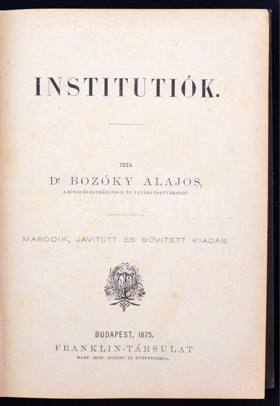 https://www.darabanth.com/en/261-Online-auction/261.0/Books/Books-Law~32/Dr-Bozoky-Alajos-Institutiok-Romai-maganjog--Bp-1875-Franklin-498-p-Korabeli-aranyozot~II1296574