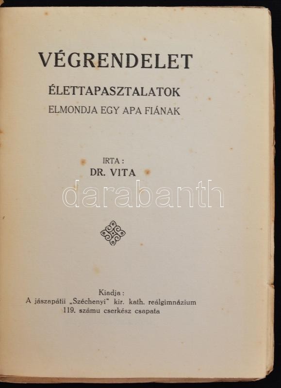 Dr. Vita: Végrendelet. Élettapasztalatok. Elmondja egy apa a fiának. ... https://www.darabanth.com/en/261-Online-auction/261.0/Books/Books-Other-rarities~43/Dr-Vita-Vegrendelet-Elettapasztalatok-Elmondja-egy-apa-a-fianak-Bp-1907--Szechenyi-ki~II1254315