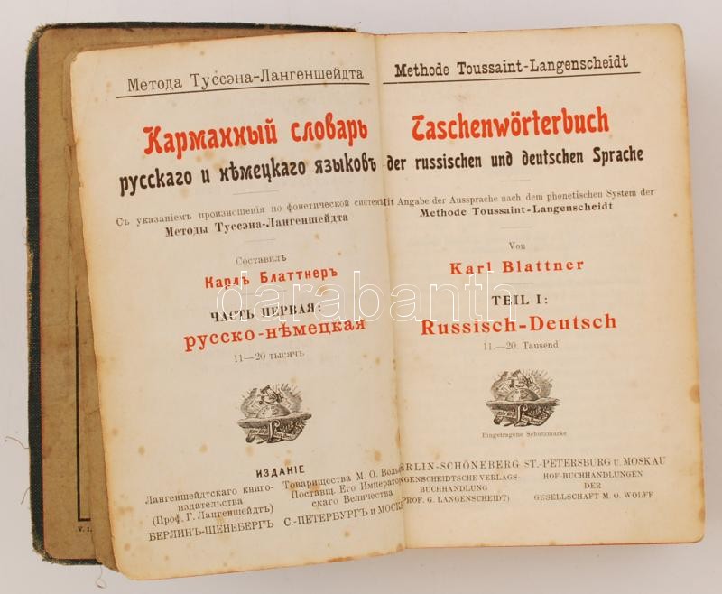 Description: Taschenwörterbuch der russischen und deutschen Sprache von Karl Blattner. Teil I-II. Berlin-Moskau, 1911. Kiadói egészvászon kötés, kopottas állapotban. / full linen binding, damaged condition