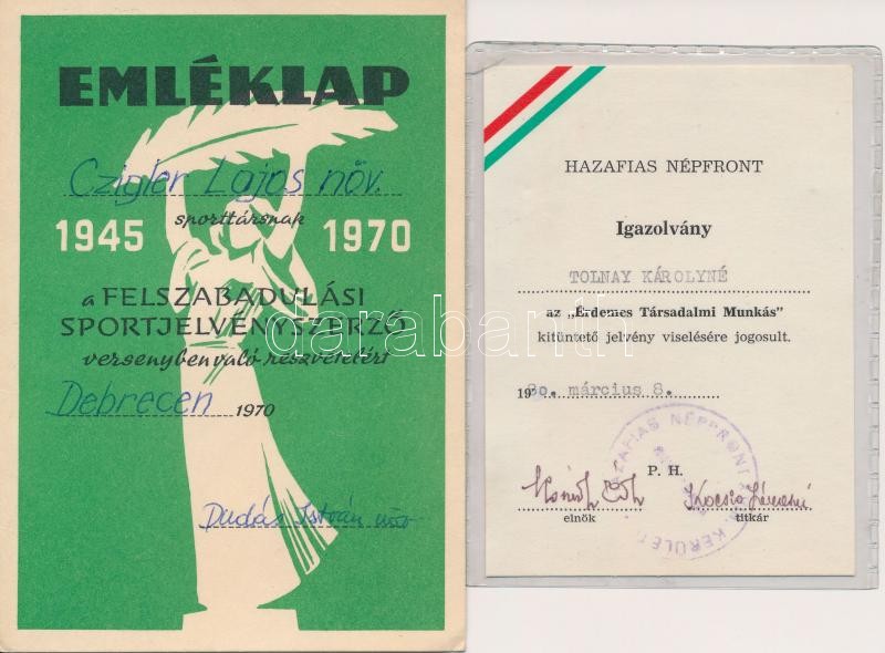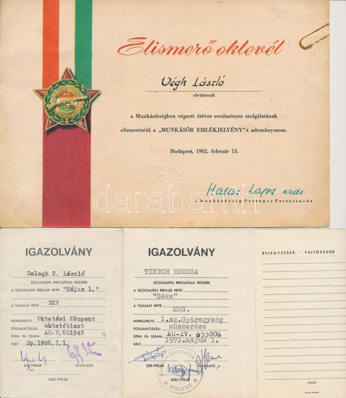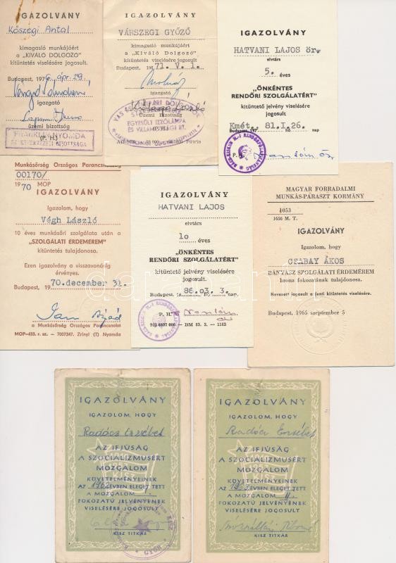 15db-os oklevél és igazolvány tétel, benne "Bányász Szolgálati Érdemérem", "Önkéntes Rendőri Szolgálatért", "Az ifjúság a szocializmusért mozgalom", "Érdemes Társadalmi Munkás" igazolványok, "Munkásőr Emlékjelvény" elismerő oklevél T:vegyes