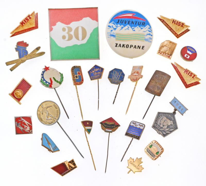 25db vegyes magyar és külföldi szocialista jelvény, kitűző, közte, 1961. "A Szakma Ifjú Mestere" zománcozott fém jelvény, "Ganz Mávag Budapest" zománcozott fém kitűző T:vegyes