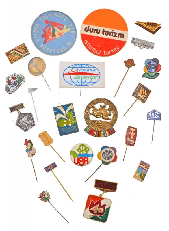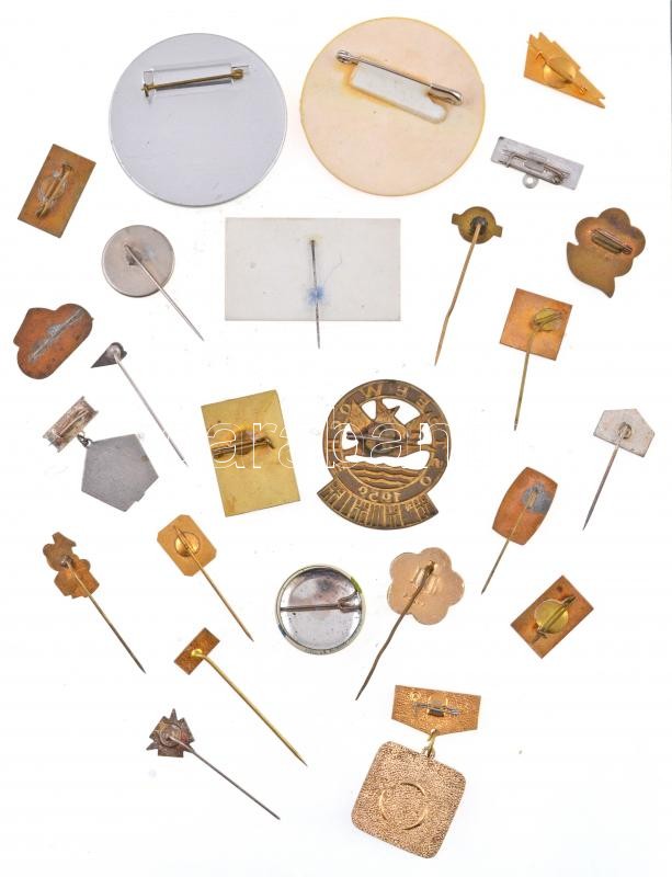 Description: 25db vegyes magyar és külföldi szocialista kitűző, jelvény, közte "Farkashegy" zománcozott fém turistajelvény, "Tisza II. KISZ Védnökség" zománcozott fém jelvény T:2,2-