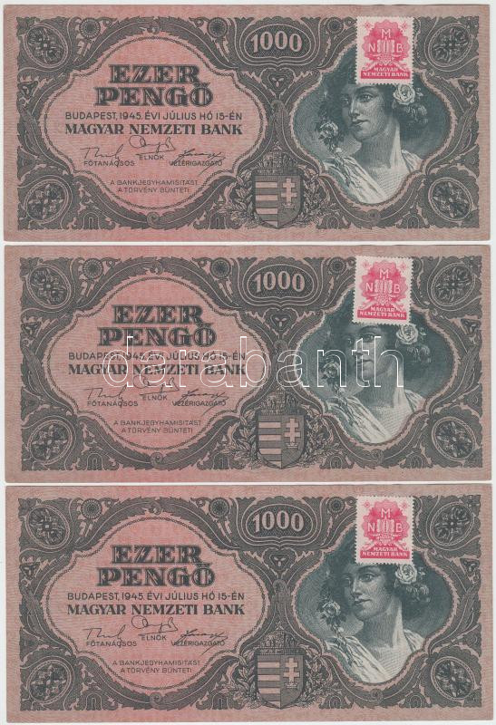 1945. 1000P (3x) sorszámkövetők, mindhárom piros "MNB" bélyeggel T:I,I-