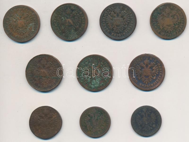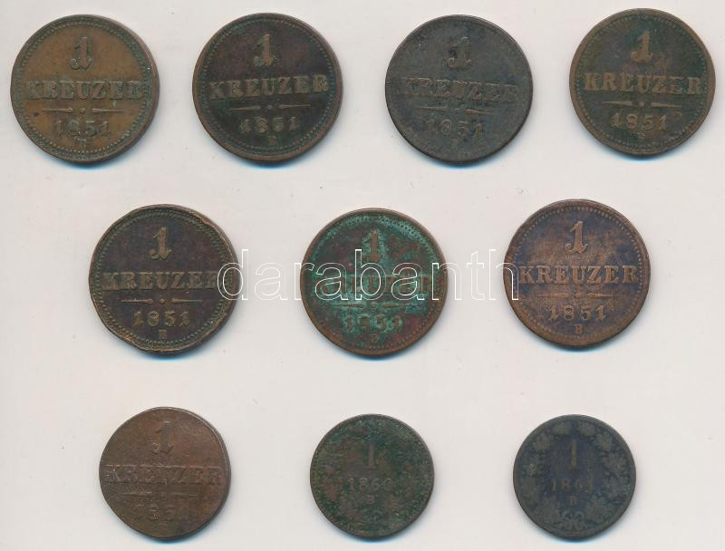 10db-os vegyes magyar krajcár tétel, közte 1851B 1kr Cu, 1860B 1kr Cu ...