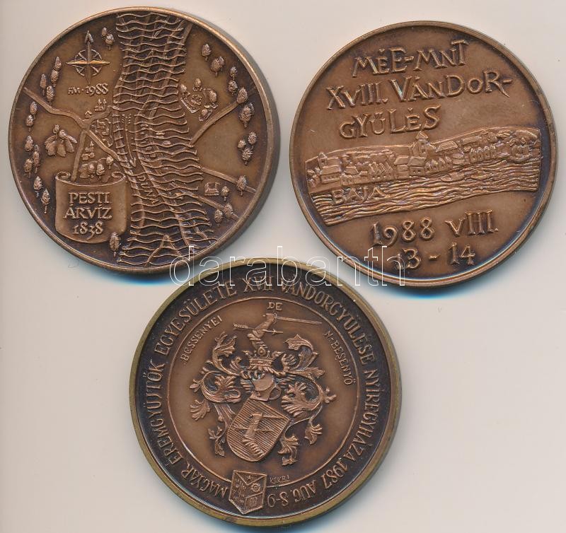 3db klf MÉE emlékérem: Kelemen Kristóf (1922-2001) / Sebestyén Sándor (1949-) 1987. "MÉE XVII. Vándorgyűlés Nyíregyháza / Bessenyei György" Br emlékérem (42,5mm) + Lantos Györgyi / Szabó Géza (1939-) 1988. "MÉE XIX. Vándorgyűlése Baja / Türr István" Br emlékérem (42,5mm) + Fritz Mihály (1947-) 1988. "MÉE - Pesti árvíz / Wesselényi Miklós" Br emlékérem (42,5mm) T:2