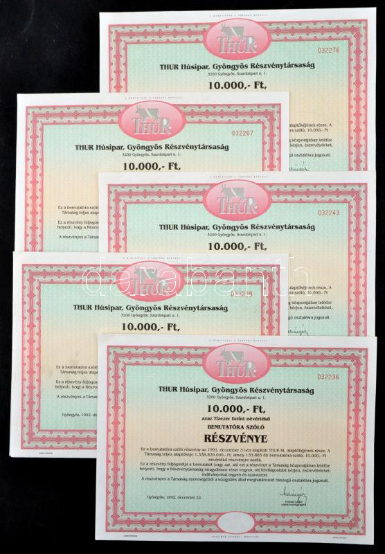 Gyöngyös 1992. "Thur Húsipar, Gyöngyös Részvénytársaság" részvénye 10.000Ft-ról szelvényekkel (5x) T:I,II közte kettő belső fele összefirkálva