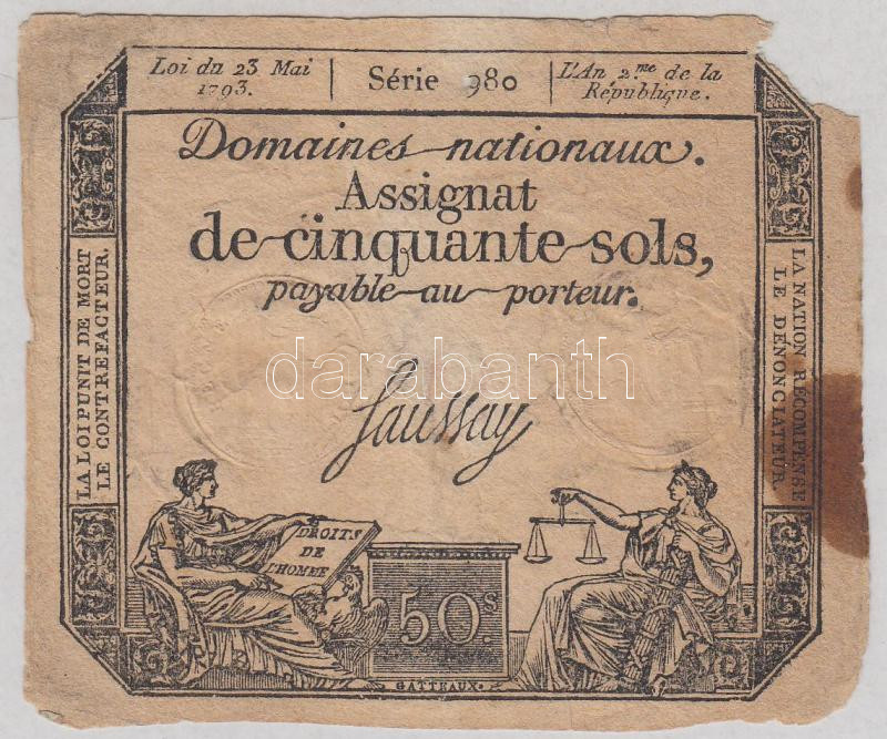 Franciaország 1793. 50s "Assignata" vízjellel és szárazpecsé... https://www.darabanth.com/en/261-Online-auction/261.0/Numismatics/Worldwide-banknotes~300012/Franciaorszag-1793-50s-Assignata-vizjellel-es-szarazpecsettel-TIII-kis-ly-ragasztasnyom-~II1290617