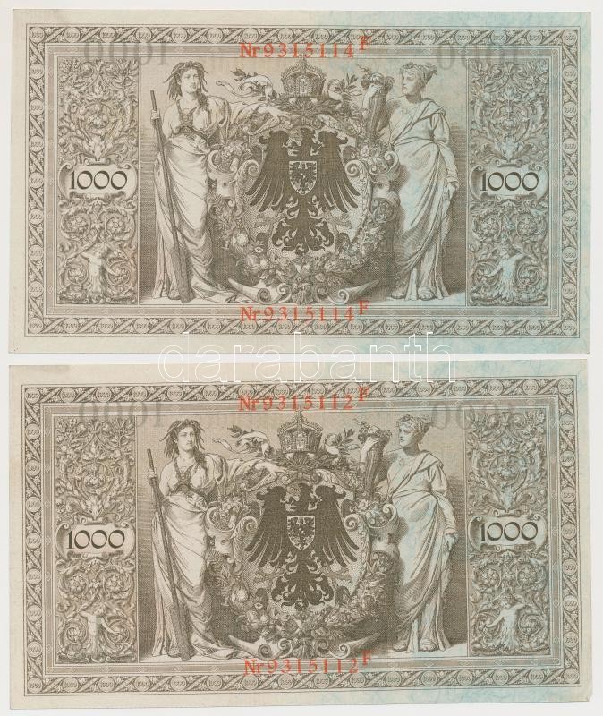 Német Birodalom 1910. 1000M (5x) hétjegyű sorszám, piros pecséttel, so... https://www.darabanth.com/en/261-Online-auction/261.0/Numismatics/Worldwide-banknotes~300012/Nemet-Birodalom-1910-1000M-5x-hetjegyu-sorszam-piros-pecsettel-sorszamkovetok-TII-II--~II1293923