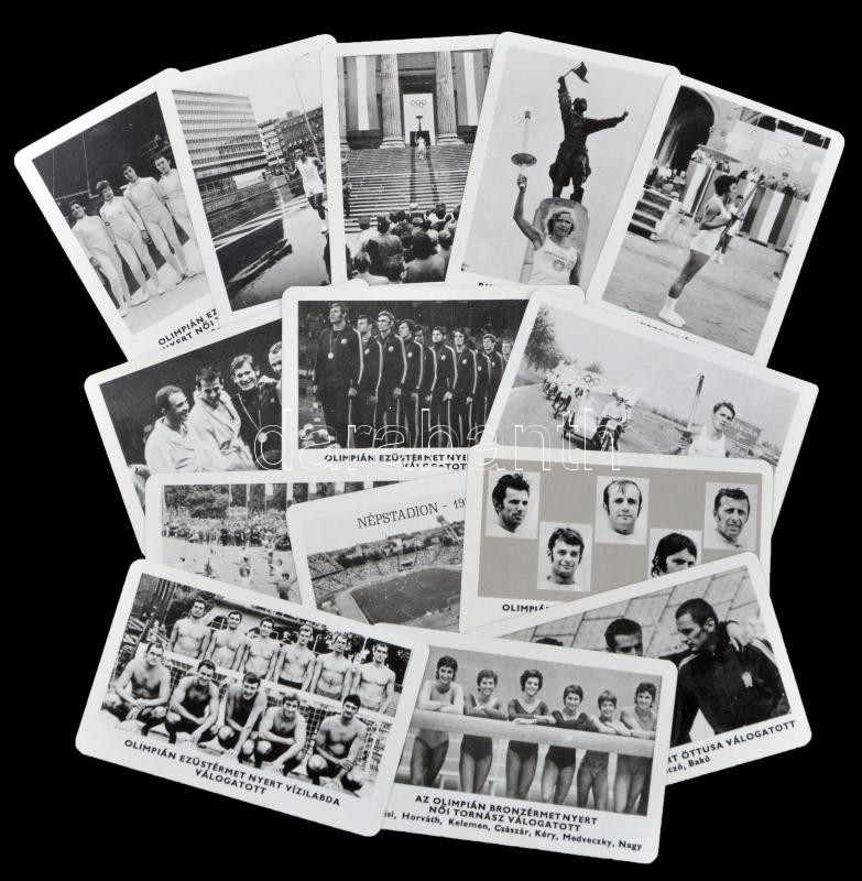 Description: 1973 Az 1972. évi nyári olimpiai játékokkal kapcsolatos kártyanaptárak: az olimpiai láng magyarországon, illetve az éremszerző csapatok csoportképei, összesen 14 db, mind különböző (Sportpropaganda Vállalat)
