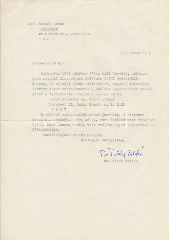 Dr. ifj. Tildy Zoltán (1917-1994) fényképész, természetfotós gépelt, autográf aláírásával ellátott levele 1992-ből.