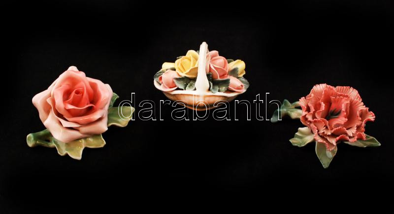 Ens porcelán rózsák, 3 db, kézzel festett, jelzett, kis kopásnyomokkal, különböző méretben
