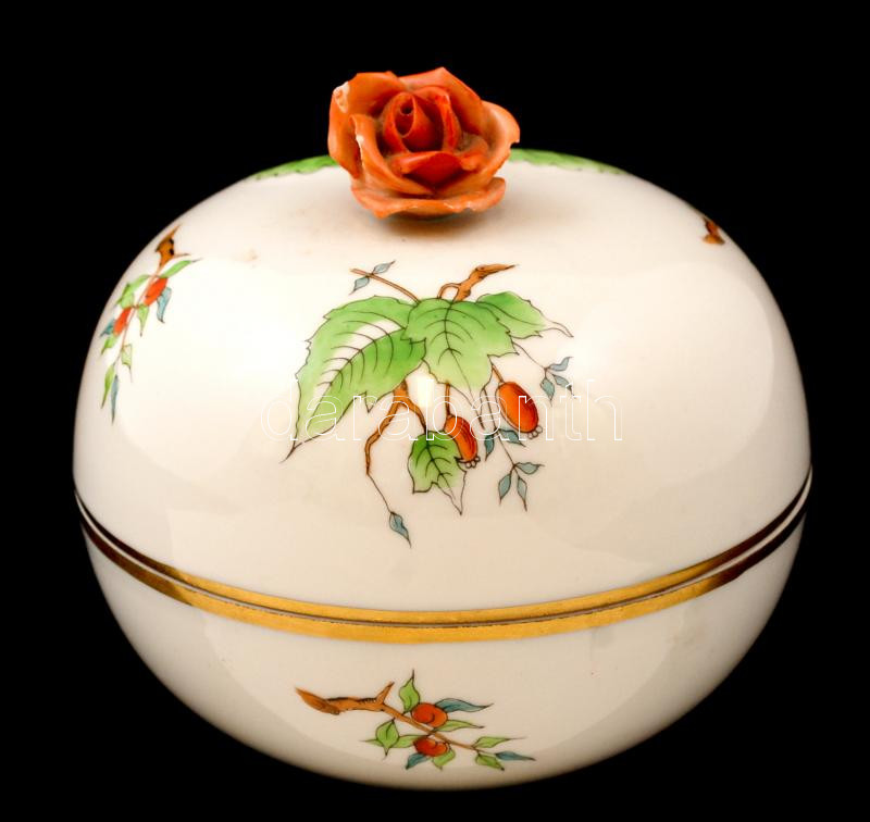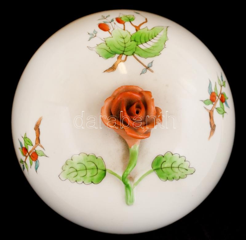 Description: Herendi virágmintás rózsadíszes nagy bonbonier, kézzel festett, jelzett, apró kopásnyomokkal, kis lepattanásokkal, a tetőn máz alatti hajszálrepedéssel, d: 11,5 cm