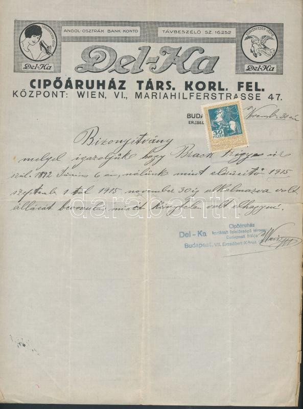 1915 Del-Ka cipőáruház Társ. Korl. Bécs, díszes fejléces hivatalos levél, okmánybélyeggel (30fill.), 29x23cm