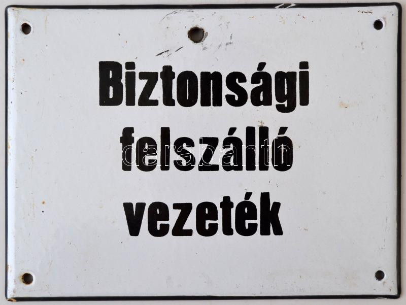 "Biztonsági felszálló vezeték" feliratú zománcozott fém tábl...