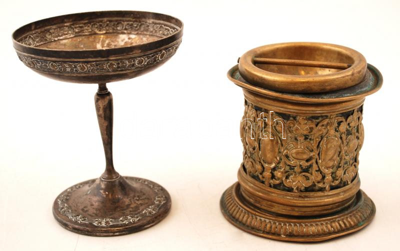 Régi fedeles réz doboz és rózsamintás fém kehely, m: 10 és 11 cm