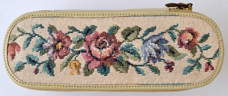 Virágmintás hímzett ruhatisztító kefe, benne mini varrókészlettel és manikűr készlettel, h: 14,5 cm