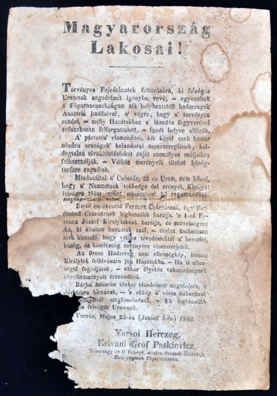 1849 Szabadságharc. Eriváni Gróf Paskievicz tábornagy, orosz tábornok ... https://www.darabanth.com/en/261-Online-auction/261.0/Other-collectibles/Historical-documents-manuscripts~16/1849-Szabadsagharc-Erivani-Grof-Paskievicz-tabornagy-orosz-tabornok-hirdetmenye-melyben-az-o~II1287861