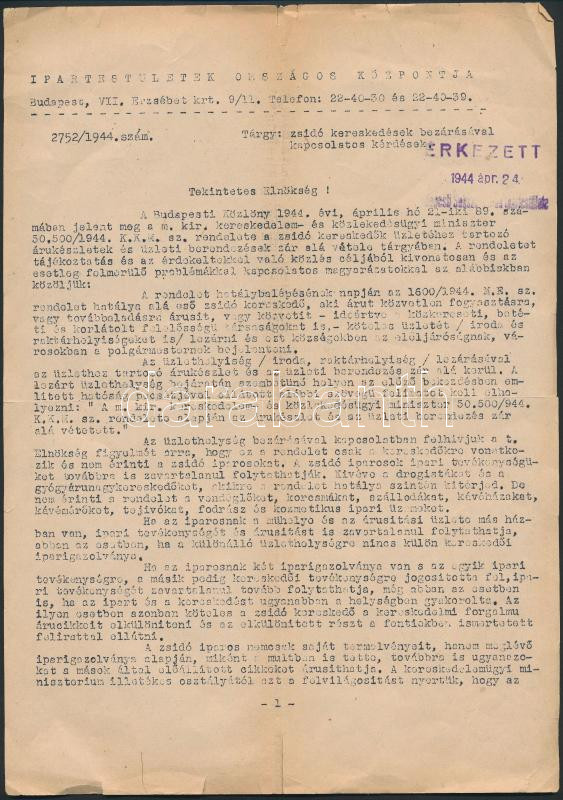 1944 Zsidó kereskedések bezárásával kapcsolatos kérdések, az Ipartestületek Országos Központjának hivatalos levele, pp.:2, 29x21cm