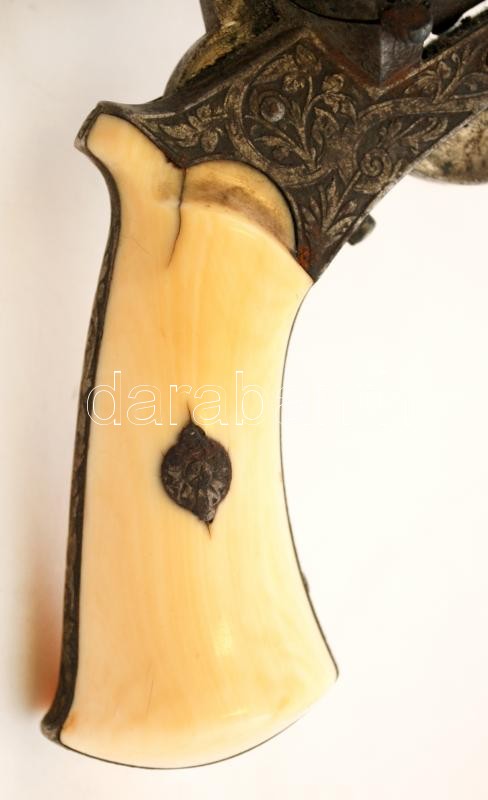 cca 19. sz.(?), gazdagon díszített csontmarkolatú revolver, rozsdás, részben működő szerkezettel, h: 19 cm