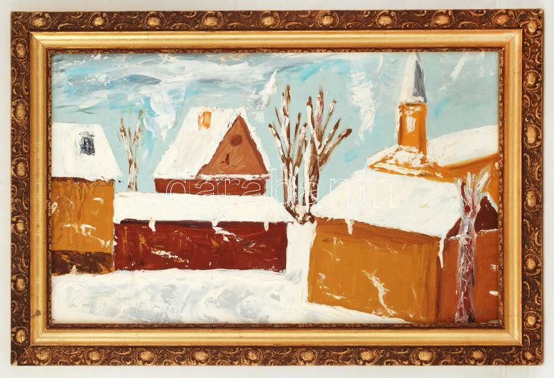 Kalló Béla: Téli táj templommal. Olaj, farost, jelzett, keretben, 36×6...