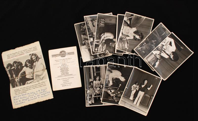 Description: cca 1972 10 db amatőr fotó a Hungária együttes koncertjéről, egy részük hátulján feliratozva, 12×8,5 cm + a Fővárosi Ifjúsági Művelődési Központ július havi programja azonosítatlan évből és egy, a Hungáriával kapcsolatos újságkivágás