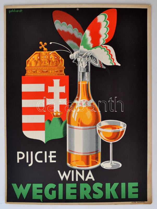 Description: cca 1930 Gebhardt: Igyál magyar bort c. plakátjának lengyel változata. Klösz nyomda. A tetején középen egy felfüggesztésre szolgáló lyukkal, szép állapotban / Polish poster for advertising Hungarian wine 24x33 cm