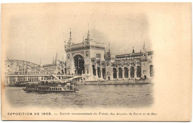 1900 Paris, 'Entrée monumentale du Palais des Arinées de Terre et de Mer' / entrance of the palace of land and sea, bridge, ship